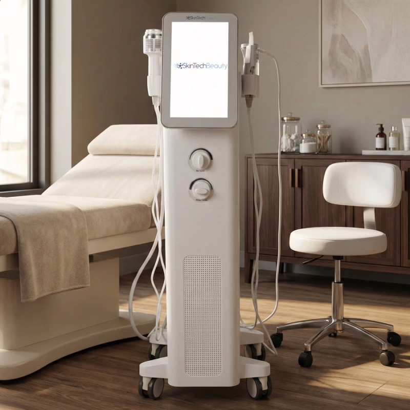 With ultrasound, aqua peeling, radio frequency, cold hammer, skin scrubber and spray function