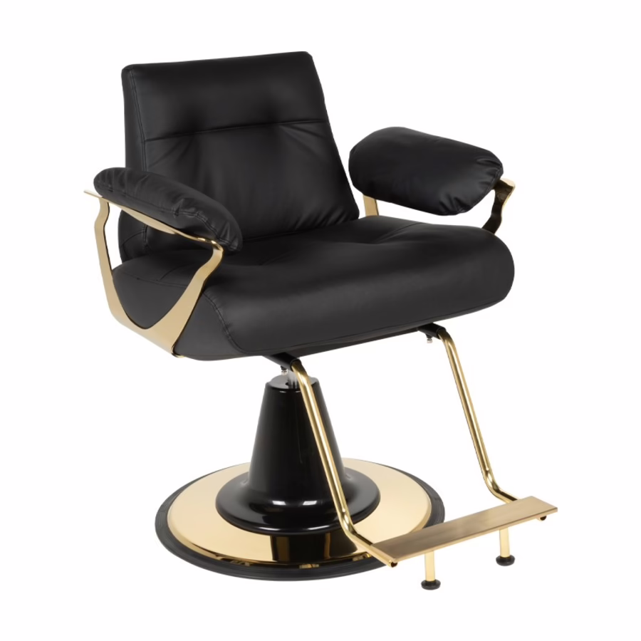 Would you like a little more glamour? Then this chair is just the thing. With its deep black, quality upholstery and its shiny gold frame, the high-quality hairdresser's chair attracts all eyes. At the same time, the classy black highlights the sparkling light reflections of the golden parts and emphasizes the noble effect of the comfortable chair.