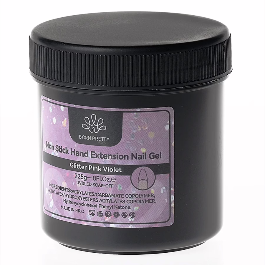 Does not stick, but lasts at least 2 to 3 weeks: the Born Pretty Non Stick Hand Extension Nail Gel in glittering pink-violet!