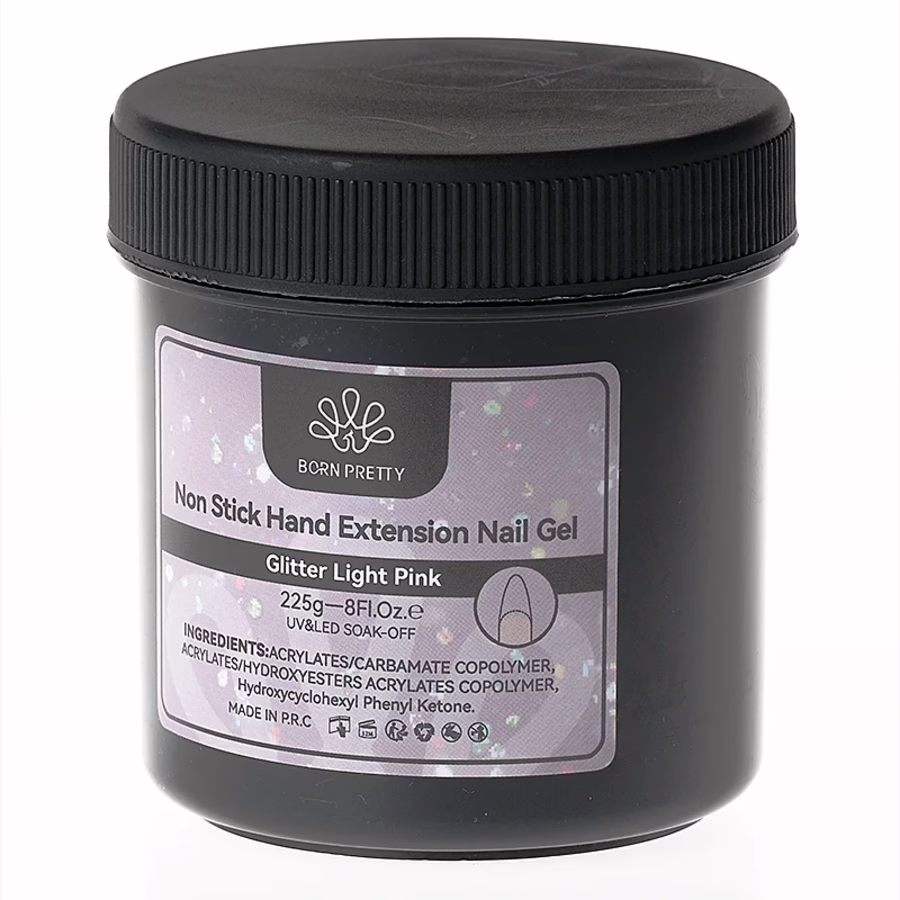 Saves time and nerves and creates spectacular nail extensions in no time at all: Born Pretty Non Stick Hand Extension Nail Gel Glitter Light Pink!