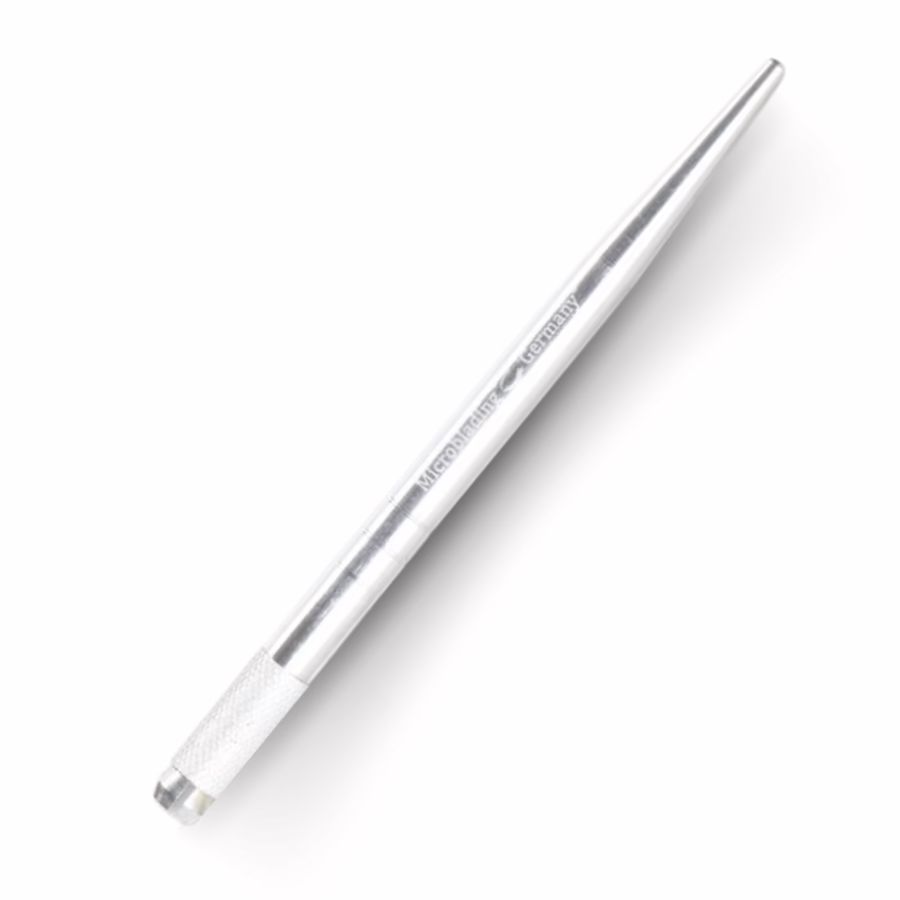 The Microblading Pen from SHR Germany is a silver handpiece with a firm grip and an attachment for the blades.