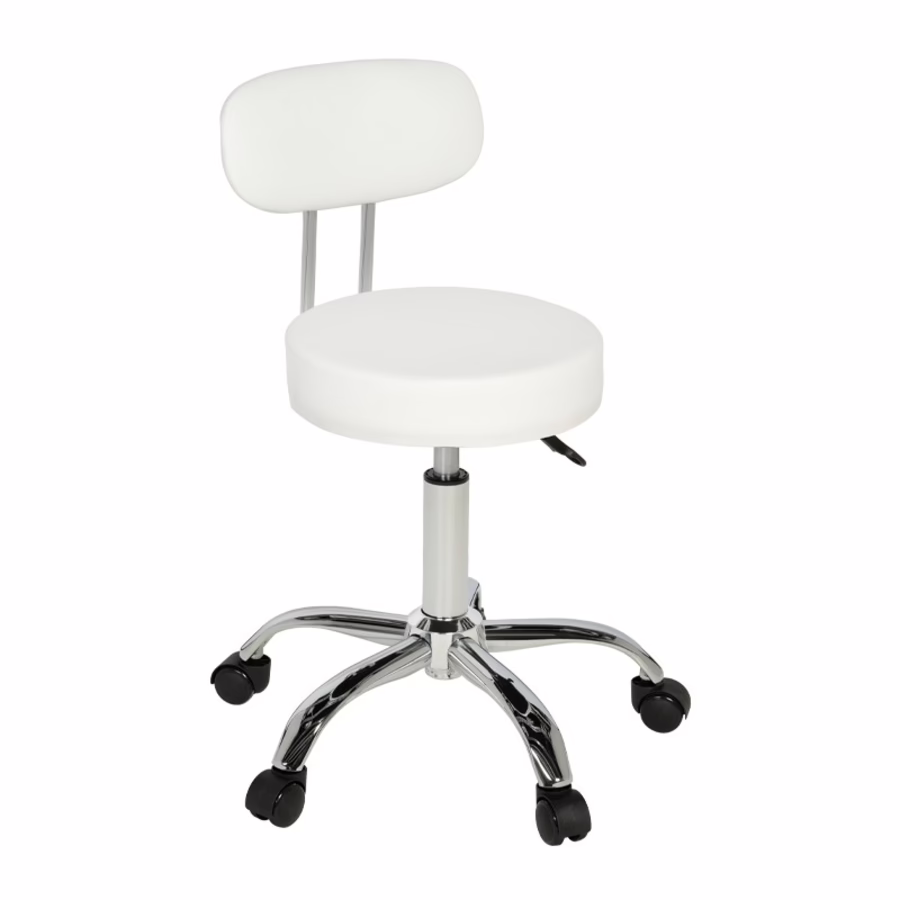 Even beauty treatments, which take a lot of time, can be carried out comfortably with this piece of furniture. Your back and neck will thank you for it. Because this swivel, height-adjustable and rollable seat follows almost every movement. Unnecessary and painful contortions are prevented from the outset. The entire musculoskeletal system, especially the spine, is protected. In addition to the chair's flexibility, this is also ensured by the particularly comfortable, thick upholstery of the round seat and the semi-circular backrest.