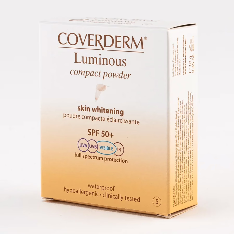 To prevent the formation of new spots, the Coverderm Luminous Compact Powder has a very high sun protection factor (SPF 50+) and protects the skin from UVA, UVB, IR and visible sun rays.