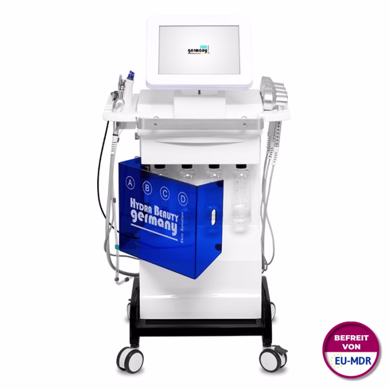 .The Light Facial Beauty device works with 4 solutions. First, water pressure and a cleansing solution are used to remove the keratinisation of the top layer of skin and remove sebum and dirt from the skin. A second cleansing solution, accelerated to high pressure, is shot onto the skin via the treatment head of the facial device and immediately sucked out again using a vacuum. The skin is deeply cleansed and then moisturised with active ingredients such as hyaluronic acid, vitamins, minerals and urea. The device is also equipped with a disinfectant solution, which is used to clean the treatment head. The treatment is painless and very pleasant.