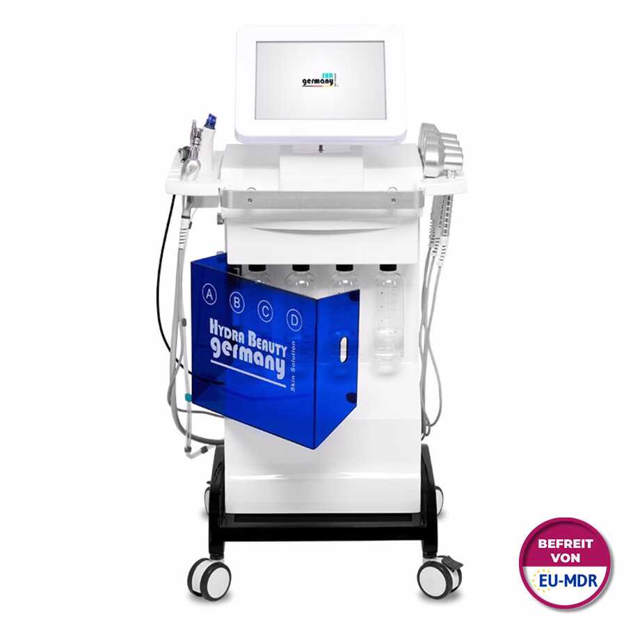 .The Light Facial Beauty device works with 4 solutions. First, water pressure and a cleansing solution are used to remove calluses from the top layer of the skin and remove sebum and dirt from the skin. A second cleansing solution, accelerated to high pressure, is shot onto the skin via the treatment head of the facial device and immediately sucked out again using a vacuum. The skin is deeply cleansed and then moisturized with active ingredients such as hyaluronic acid, vitamins, minerals and urea. The device is also equipped with a disinfectant solution, which is used to clean the treatment head. The treatment is painless and very pleasant.