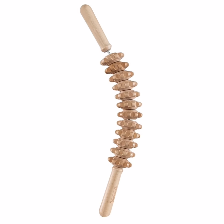 Hard wood for soft skin and relaxed muscles: the SHR Germany Maderotherapy curved diamond roller with 11 wheels.