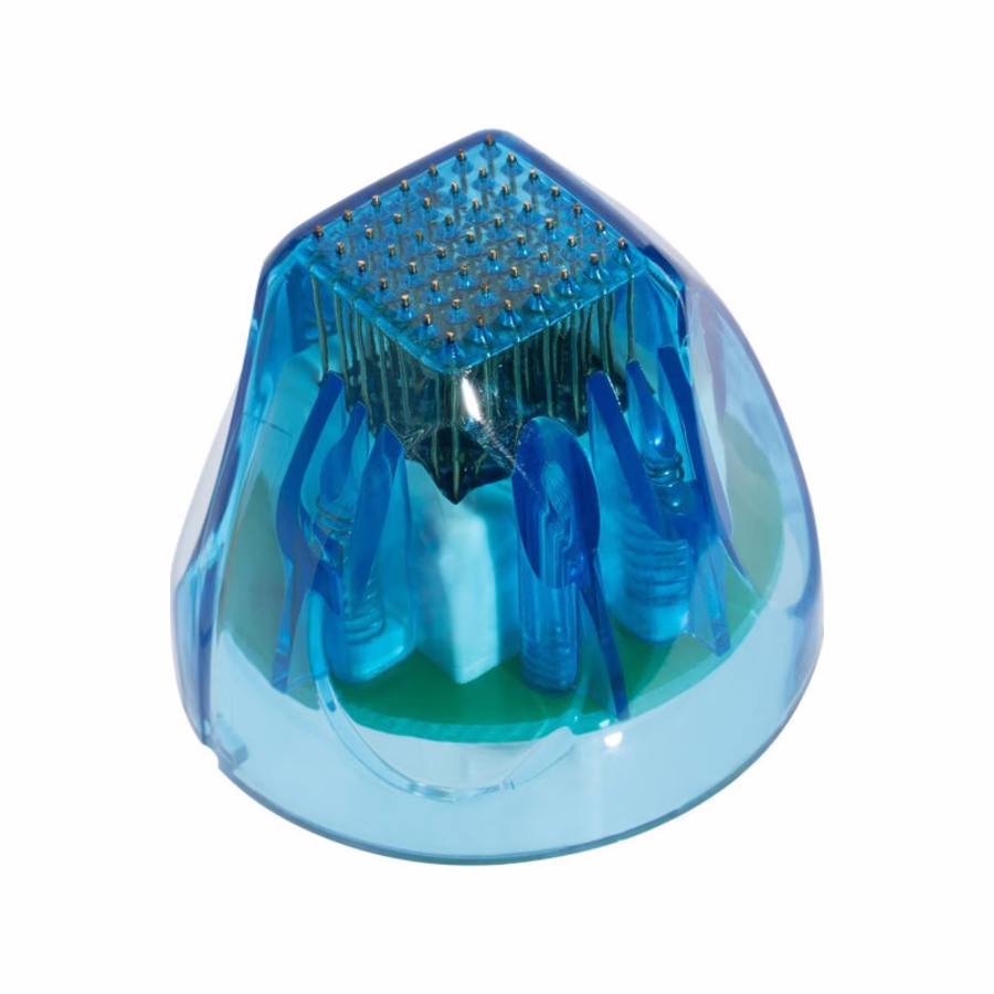 Instead of wafer-thin needles that penetrate the epidermis, this needle attachment has 49 fine contact points that are simply placed on the surface of the skin. The radiofrequency energy of the SkinTechBeauty 2 in 1 V RF Pro Microneedling device is delivered into the skin at these contact points to achieve the skin-rejuvenating effect.