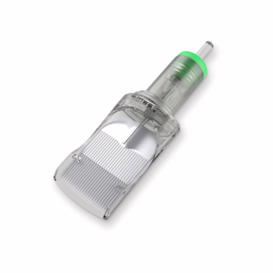 M1 (also MG) stands for Magnum and describes the arrangement of the needles in 2 rows: the top row consists of an even number of needles, the bottom row of an odd number. The wide arrangement makes them ideal for shading large areas. The SUPER BIG MAGNUM Cartridge Needles 1235M1 can also be used to create even color gradients and fill-ins . The skin is also less irritated as fewer passes are needed to work in the color.