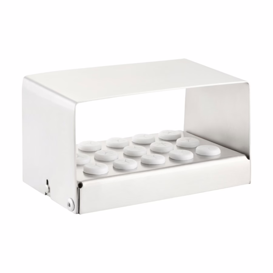 The stand is made of stainless steel and is easy to clean. It has space for 15 attachments, which are held in place by white silicone handles. This allows you to move the drill stand safely without the attachments slipping or even falling off.