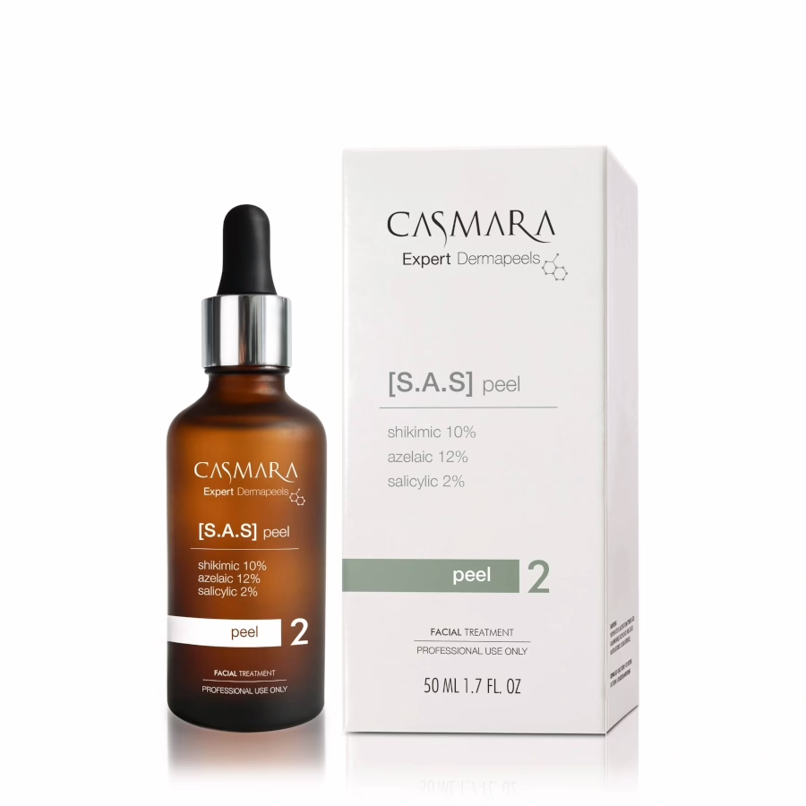 The innovative and unique S.A.S Peel from Casmara combines three different acids with different penetration depths - for perfect exfoliation on all levels and all-round skin care! The S.A.S Peel cleanses thoroughly and deeply, removes sebum deposits and skin flakes, detoxifies the skin, clears the pores and balances sebum production. The application is recommended for all ages and skin types, especially young, impure, oily or unbalanced skin benefits from the effective unisex formula.