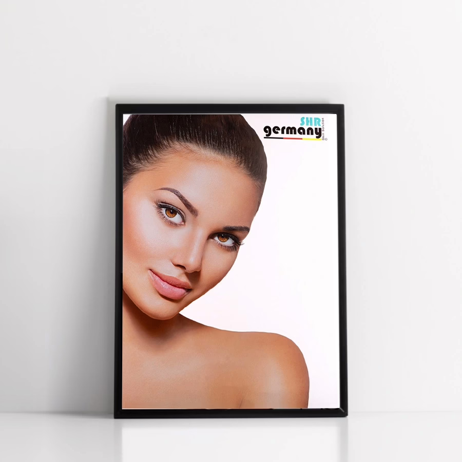 Appealing and sales-promoting: With the SHR Germany advertising poster for skin rejuvenation treatments, you can show your customers a beautiful example of perfectly successful skin rejuvenation. Perfect, plump skin with an irresistible, youthful glow, full, soft lips and no trace of wrinkles - the photo motif leaves nothing to be desired.