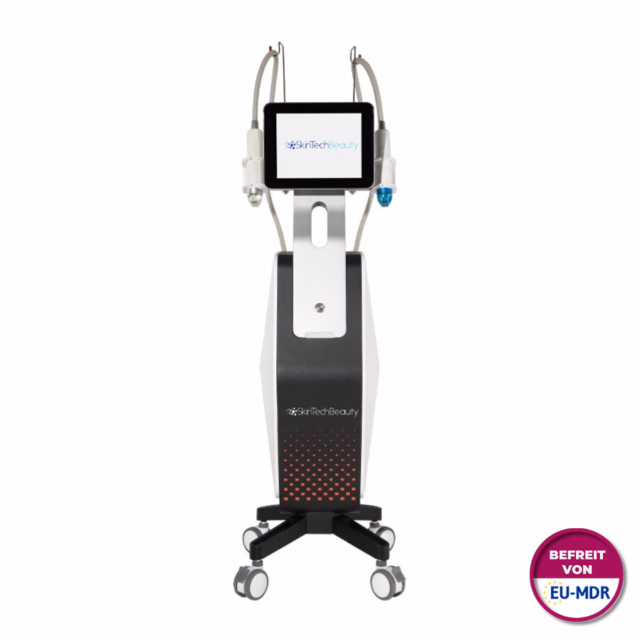 No other cosmetic treatment is as popular as anti-ageing. Whether for the prevention of wrinkles or the targeted reduction of existing signs of ageing, many customers want to be pampered with skin-tightening treatments. Microneedling, which uses wafer-thin needles to stimulate the skin to heal itself and reduce skin blemishes such as wrinkles, stretch marks, scars and fine lines through the natural regeneration process, is particularly popular. With the SkinTechBeauty 2 in 1 Revo RF Pro microneedling device, you can go one better, as the device combines regenerating microneedling with the firming effect of radio frequency energy - for highly effective anti-ageing treatments on the face and body! But it gets even better: thanks to two handpieces, you have the option of performing both invasive and non-invasive skin tightening treatments.