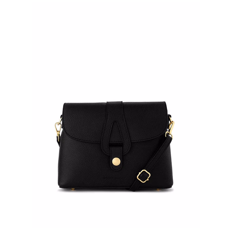 The "Lilly" small flap bag from STUFF MAKER is the perfect choice for women looking for a minimalist yet expressive accessory. In classic black, this bag impresses with its clean lines and high-quality, textured leather. The striking highlight is the gold-coloured latch fastening, which looks particularly elegant against the deep black leather and gives the bag a luxurious touch.