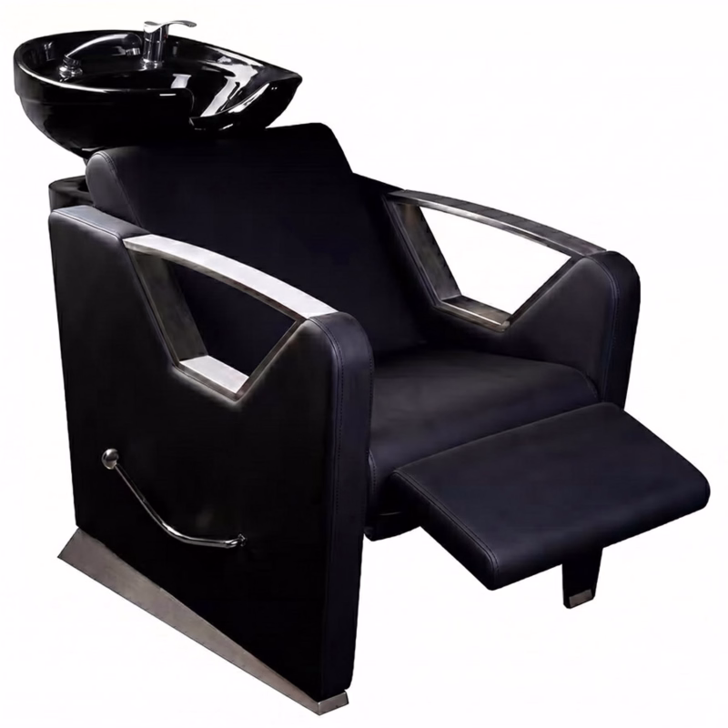 The hairdressing wash unit with integrated backwash basin is the ideal piece of furniture for your salon. It is not only beautifully designed, but also ergonomically built. The seat and backrest are made from a single piece of black PVC imitation leather. The faux leather foot section can be folded out. This means that the customer can be placed in the optimum back or sitting position for you and them. The neck recess on the ceramic basin is also particularly comfortable, offering your customer's head and neck a stable and comfortable position during washing.