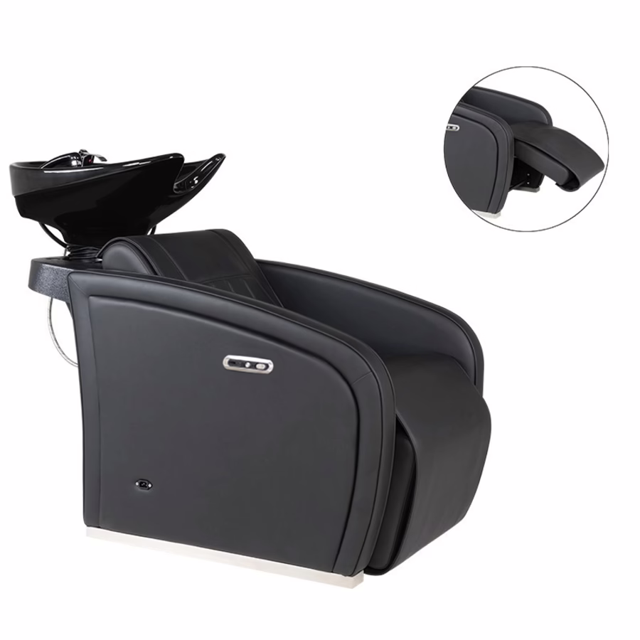 The black hairdressing wash unit with ceramic wash basin and massage function impresses with its quality, comfort and style - a real eye-catcher in any salon.