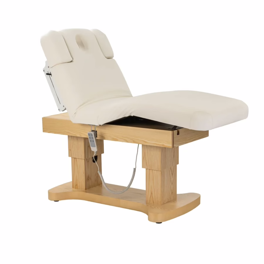 electric adjustability, but also with the fact that it allows you to raise your clients' legs higher than their upper body. This is a great advantage for treatments on the legs, such as targeted lymphatic drainage or a pedicure.