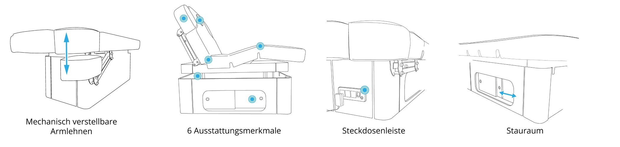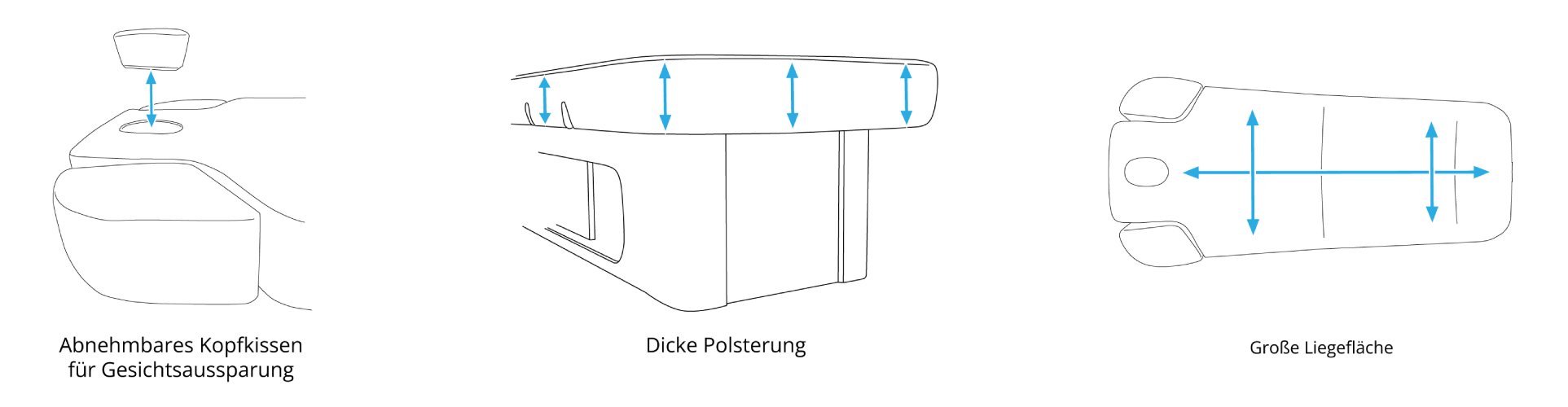 The table is also equipped with flexible modules in the shoulder area: the shoulder/arm supports can be hydraulically adjusted downwards to provide more space for your clients' arms during treatments on their stomach. More comfort is hardly possible!