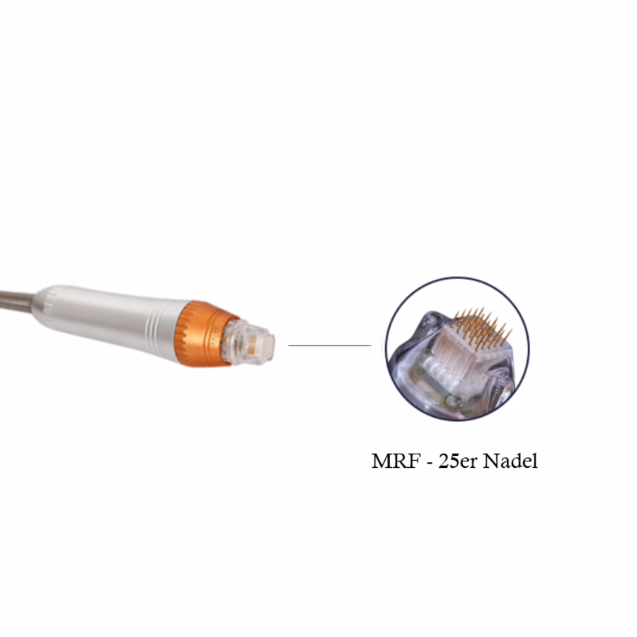 The 25 MRF needle offers 25 strung, wafer-thin, gold-plated micro-needles that penetrate the skin within milliseconds. This creates tiny channels in the skin tissue that promote the absorption of nourishing serums and activate the skin's natural healing process. New cells are formed, which improve the skin's appearance. In addition, collagen and elastin production is stimulated, which tightens the skin's surface.